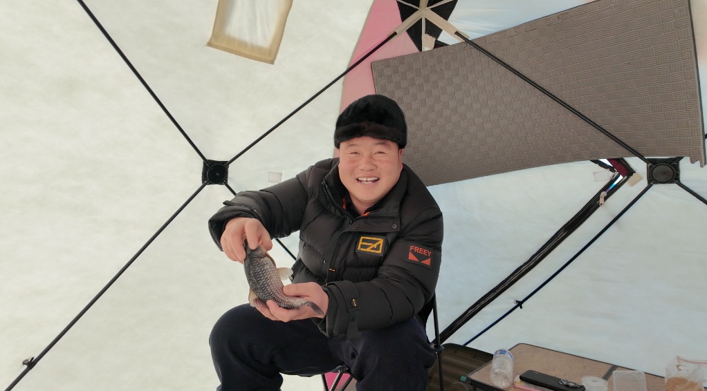 清晨的乌拉盖湖,冰层厚达数十厘米,如一块巨大的银镜铺展在天地间,脚下积雪踩上去“嘎吱”作响。冰面上,彩色保暖帐篷错落排开,像散落在雪原上的斑斓糖果。冰钻凿冰的“嗡嗡”声此起彼伏,冰屑飞溅间,钓友们弯腰调漂、挂饵,动作麻利。